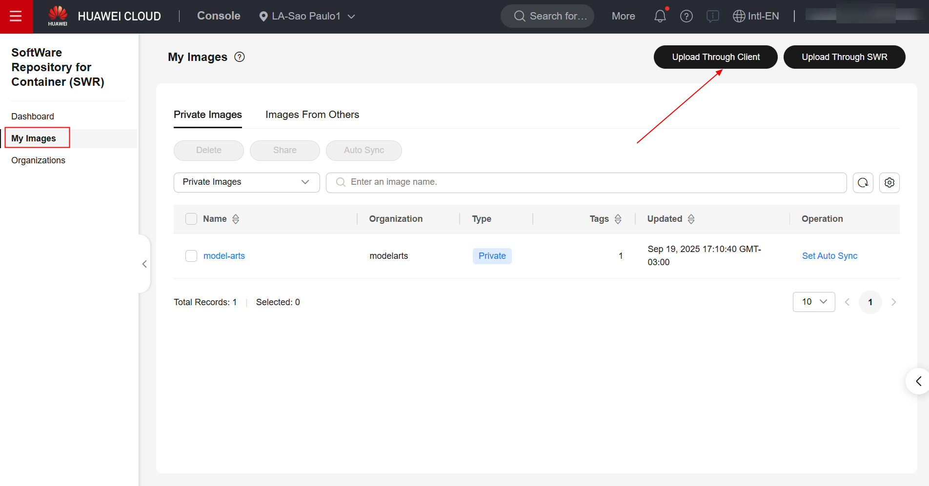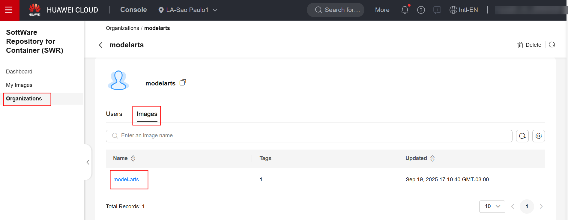 Verify in the SWR console that the image was successfully transferred to the SWR repository: