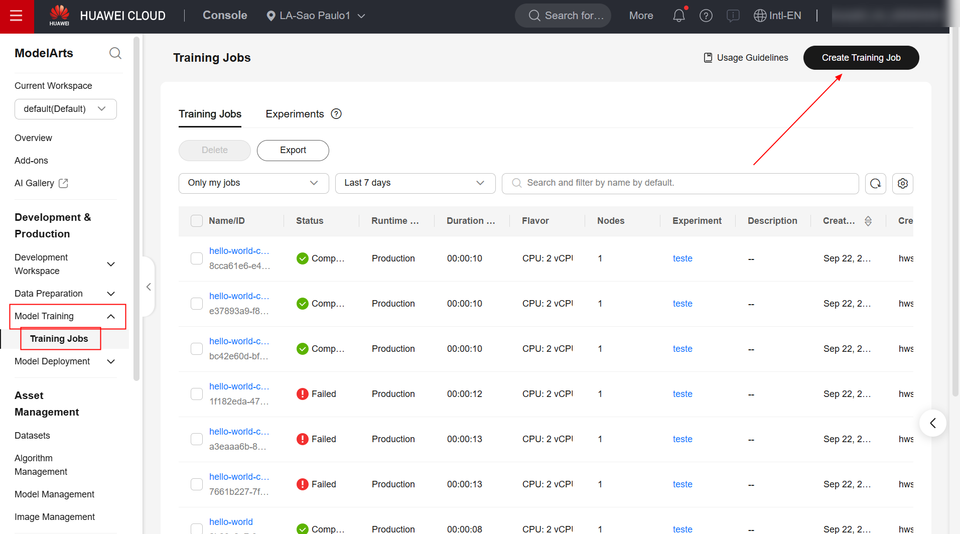 To create a model training job in the ModelArts service, first navigate to the product page in the Huawei Cloud console and click “Create Training Job.”