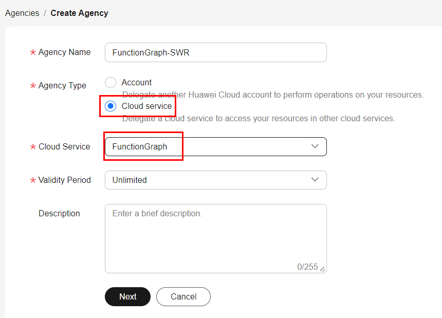 Give the agency a name, select the agency type as “Cloud Service”, and select the FunctionGraph service. Click “Next” to proceed.