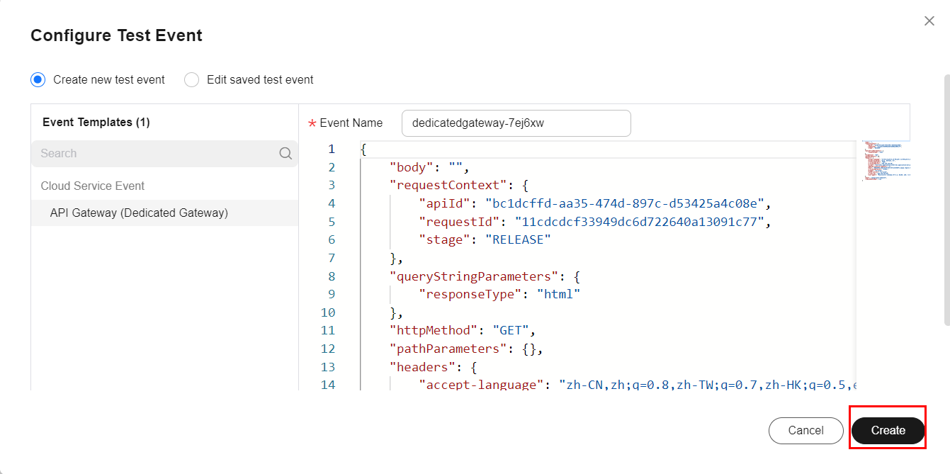 Once you have created the function, click “Test” to test the created function. Confirm the example of the HTTP request received and click “Create”. Click “Test” again to test the created function.