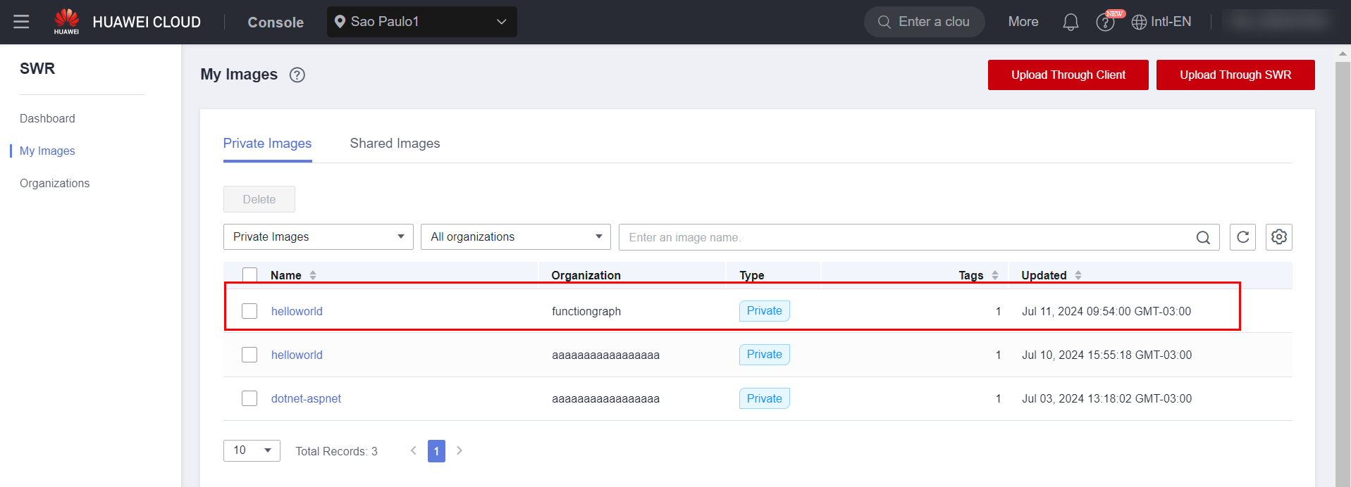 On the SWR service page in the HWC console, You can see that the image has been successfully published to the repository: