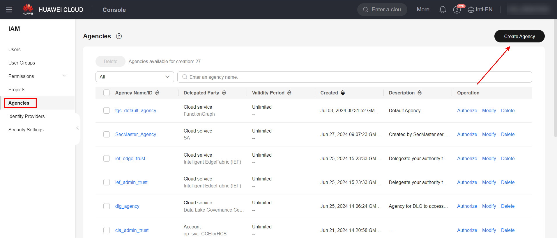 To delegate permissions from the object storage (OBS) service to FunctionGraph, it is necessary to create an agency with permissions over OBS. Navigate to the IAM service in the Huawei Cloud console and click the “Agencies” page. Click “Create Agency” to create an agency.