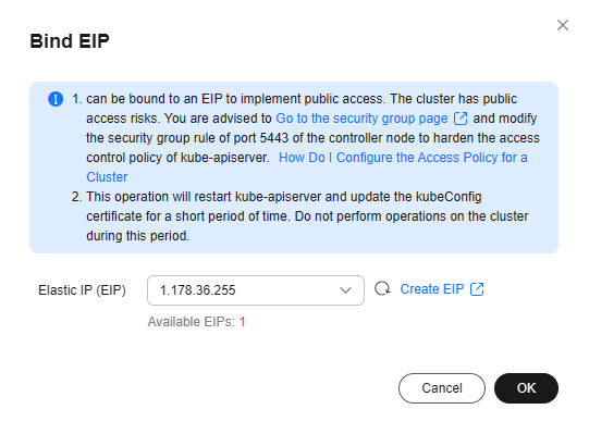 In the CCE instance page, click on Overview>EIP>Bind