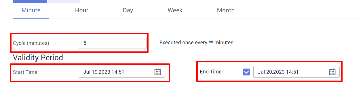 • Configure the schedule Execution to verify changes in the source and update in the destination bucket. In this case, the chosen time cycle is 5 minutes, to be executed for 24 hours (Image 15);